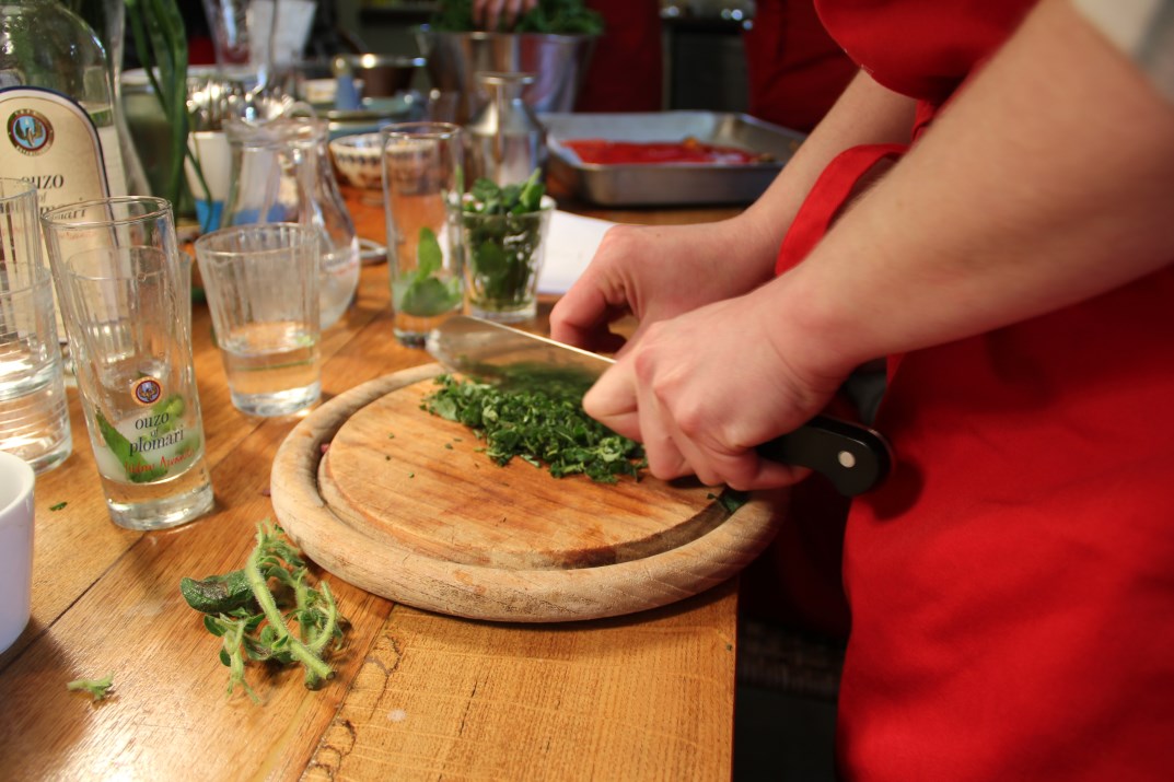 We arrived in the morning to her inviting, rural home for a Greek cooking workshop, where we joined five other participants. We entered a kitchen full of spices, cookbooks, fragrances, a warm atmosphere and sat around a large dining table in an informal atmosphere with pleasant Greek music in the background. We put on Bossi’s red aprons and immediately got into the mood.