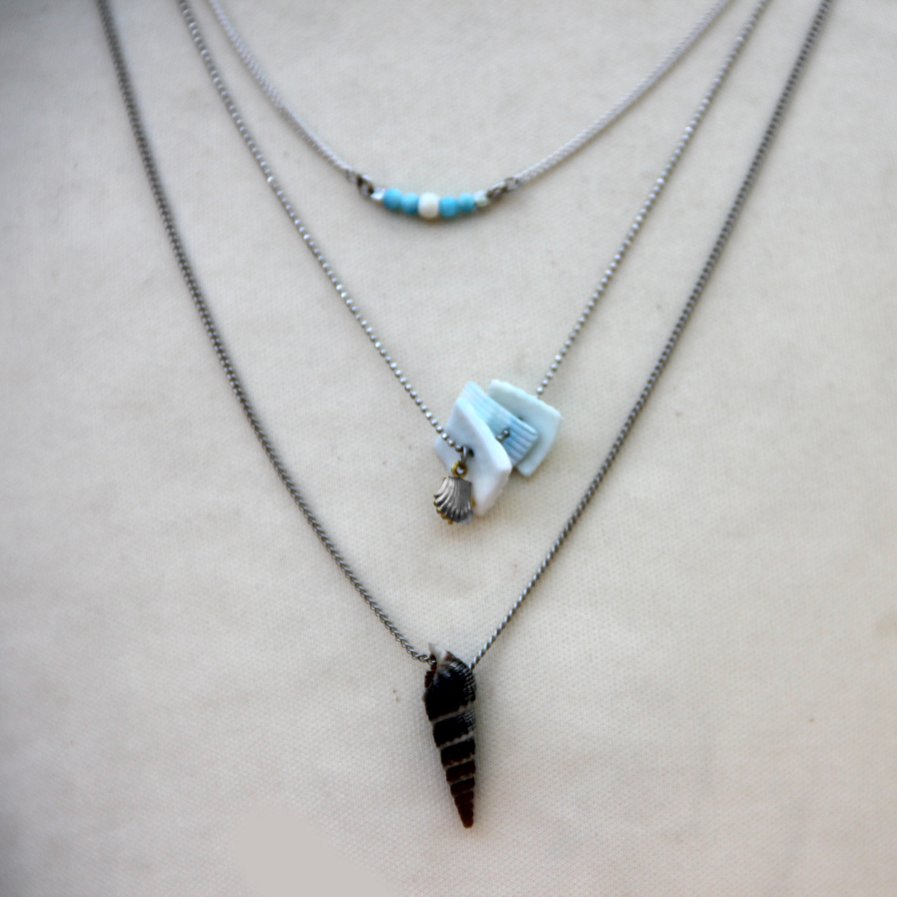 שרשרת שכבות בציפוי כסף ותכלת משולבת אבני טורקיז, וצדפים.