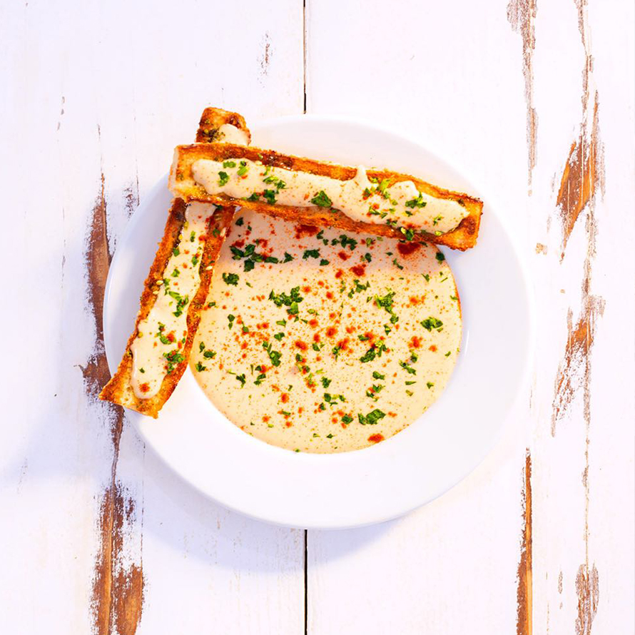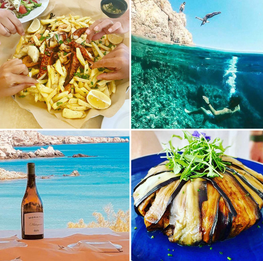 המאכלים מבוססים על תפריט יווני- ים תיכוני, כולל מנות דגל חומוס ושקשוקה ישראלים, ומורכב ממוצרים טריים ומקומיים, כמו, פירות וירקות שמגדלים עבורם במיוחד, גבינות ויין המיוצרים עבורם במיוחד, ודגה טרייה ומקומית שמוגשת בצלחות הים והפירות ים לאוהבי הז’אנר.