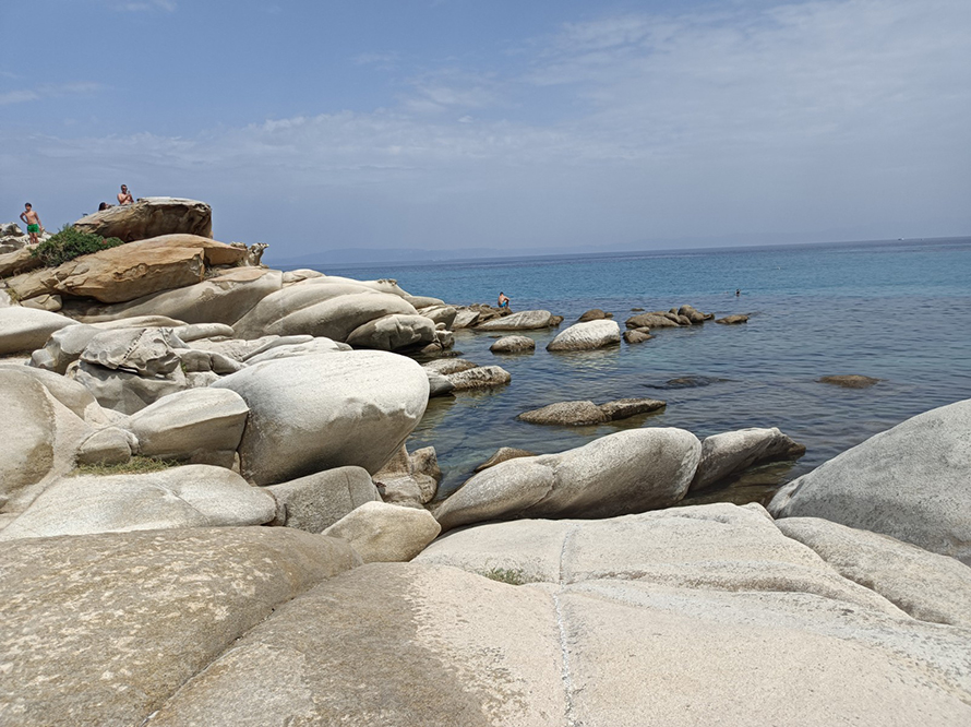 הגענו לחוף מושלם בחלקו המזרחי של חצי האי, Karydi , עם סלעים לבנים וחלקים שכאילו נשפכים לחוף, שיוצרים נוף ירחי, עצים שמגיעים לקו החוף וכרגיל מים צלולים ושקטים. קצת יותר המוני מהחוף הפרטי שלנו במלון, אבל הטבע מרהיב ושונה.