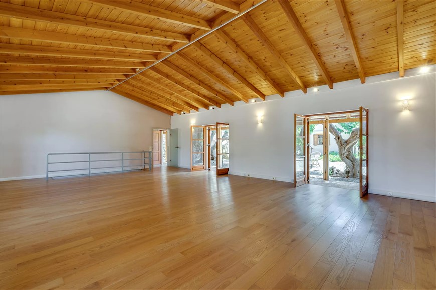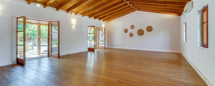 והסיבה שלשמה התכנסנו – סטודיו רחב ידיים בגודל 65 מ”ר עם רצפת עץ, חלונות צרפתיים כפולים הנפתחים לפינות ישיבה חיצוניות, לגינה מטופחת ועם ריחם המשכר של הצמחים הנישא באויר.