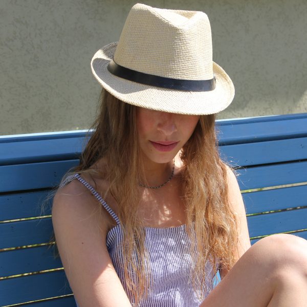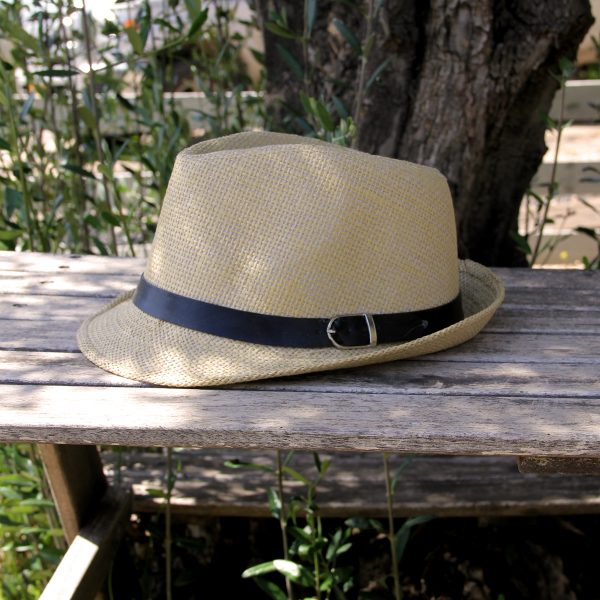 כובע קש בעיצוב מגבעת, בעל שוליים צרים בגוון טבעי, קל ונוח, עם רצועה שחורה ואבזם מסביב.